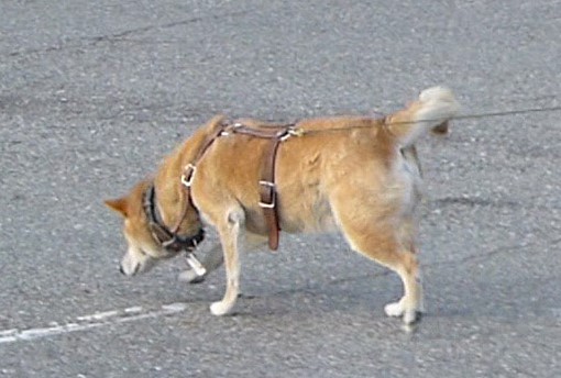 The dog must track wearing a non-restrictive harness. It can be made of any material, with the most common types being leather and cotton/polyester fiber. A line is used to connect the dog and handler. For field tracking, a 40 line is typically used, although urban tracking doesn’t necessarily call for such a long line. This picture shows Take, my Shiba Inu, tracking on asphalt.